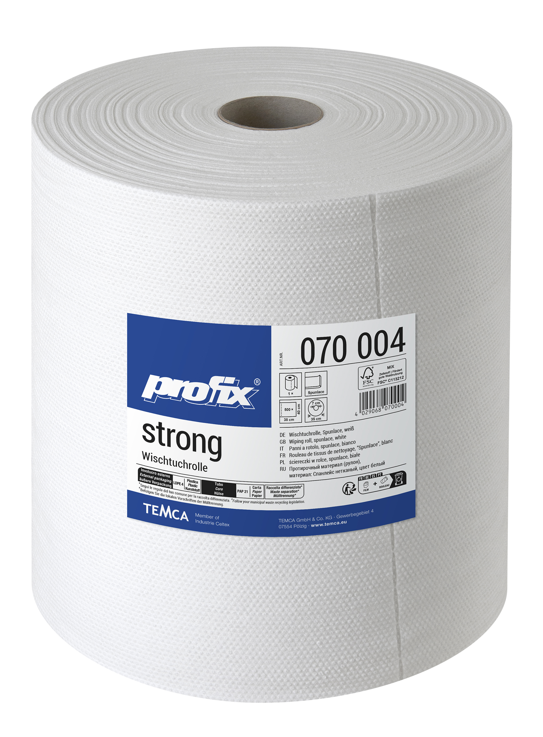 profix® strong is a highly absorbent high-performance wipe made from a cellulose, polyester, and polypropylene fiber blend, specifically designed for heavy-duty cleaning tasks. The wipe is very voluminous, features an embossed structure, and is exceptionally soft while remaining robust and abrasion-resistant, even tear-resistant when wet. It is wringable, reusable, and particularly environmentally friendly, thanks to its FSC®-certified non-woven quality.